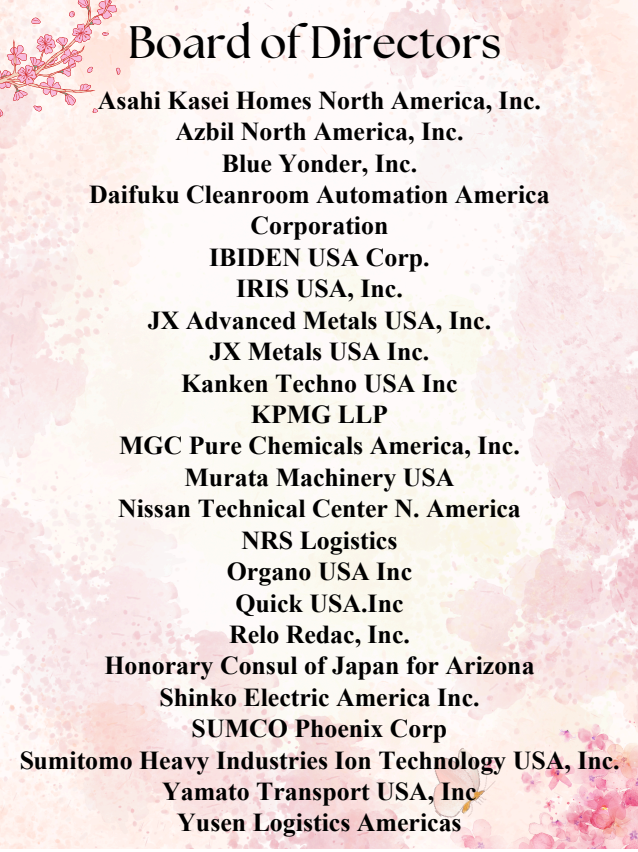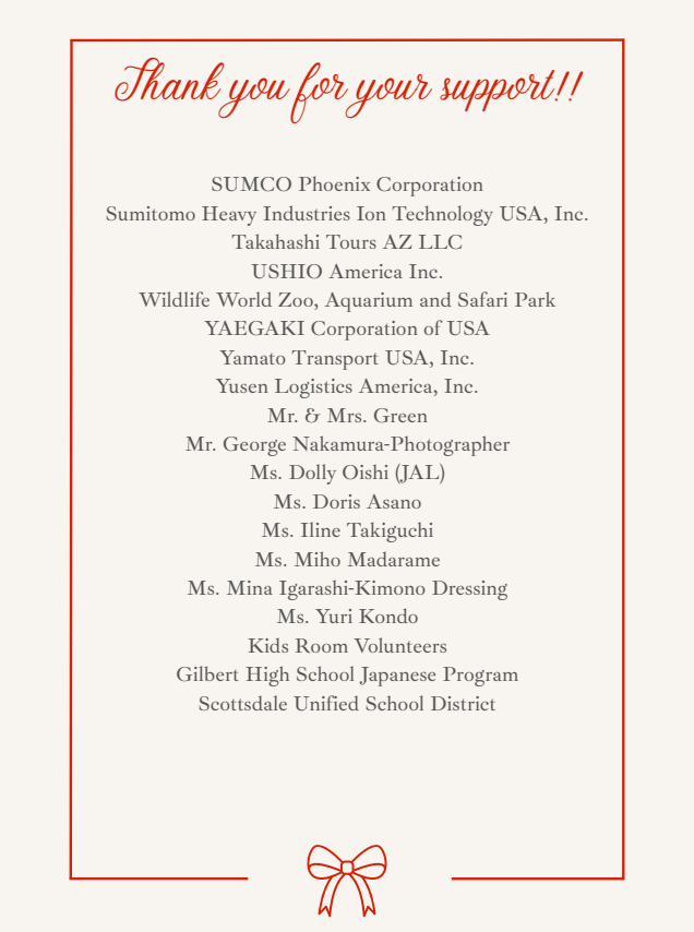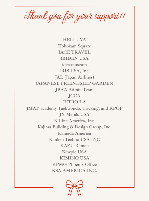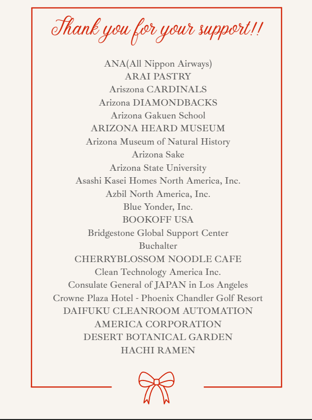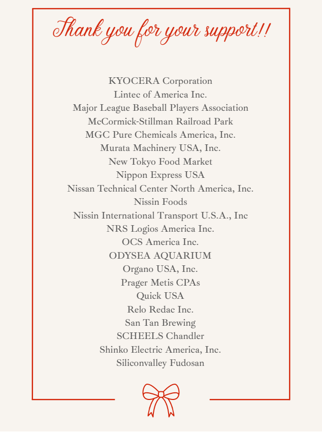 On behalf of Japan Business Association of Arizona, I would like to extend our deepest gratitude for your generous support. Thanks to your contribution, our New Year’s Celebration Party was a tremendous success. We sincerely appreciate your partnership and look forward to continued collaboration in the future.